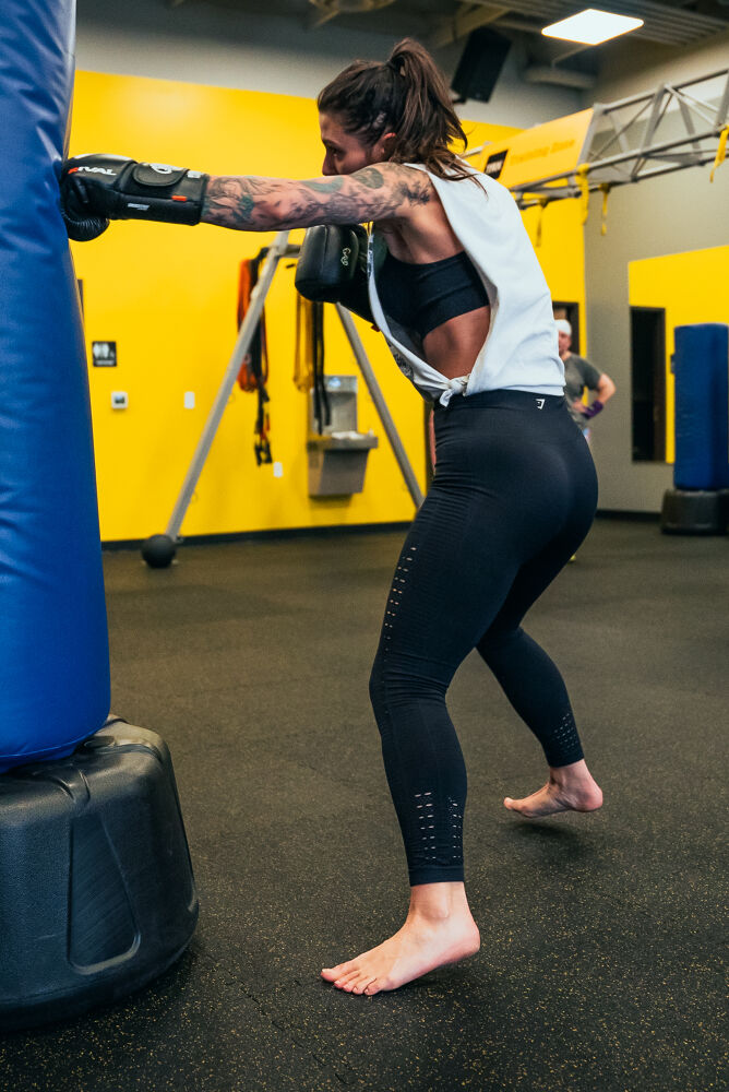 Classes feature punch-and-kick combinations, footwork drills, core training, and conditioning intervals in a fun, empowering environment.